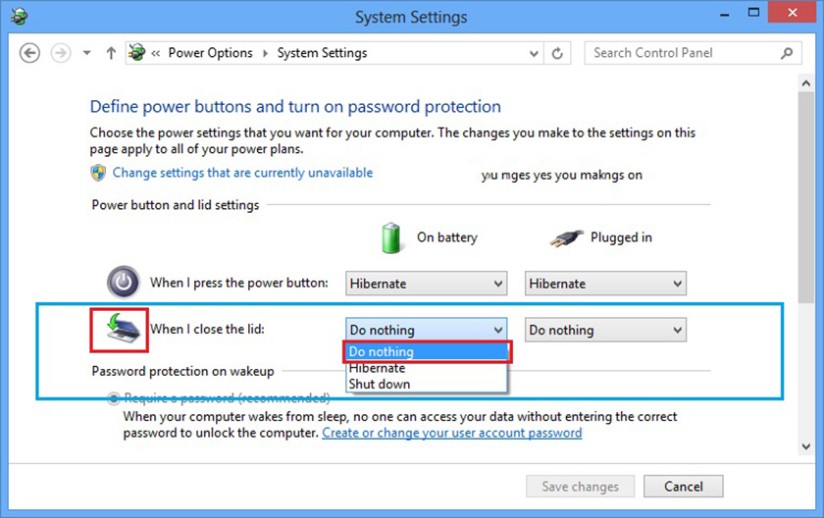 Trong giao diện System Settings, xuống phần When I close the lid, bạn chọn “Do nothing” trong danh sách menu xổ xuống ở cột “On battery” và “Plugged in” như hình. Cuối cùng nhấn Save changes ở bên dưới để lưu lại thay đổi.