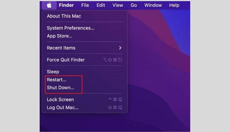Bước 1: Tắt thiết bị – Click vào logo Apple ở góc trên thành Menu ở bên góc trái màn hình và chọn Tắt máy (Shut Down).