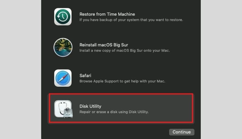 Bước 4: Ở cửa sổ tiện ích, click Disk Utility (tiện ích ổ đĩa) → click Continue (Tiếp tục)