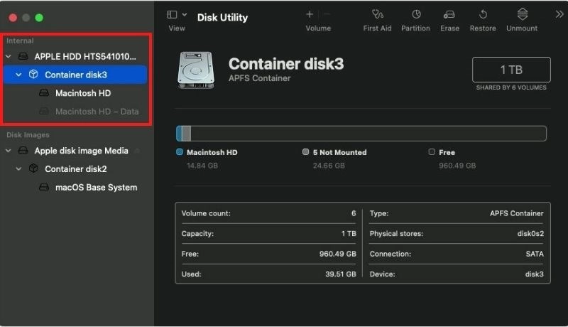 Bước 6: Nếu bạn từng sử dụng Disk Utility để tại phân vùng trên ổ Macintosh HD, hãy chọn từng ổ đĩa con bên trong sau đó nhấp vào nút xóa phân vùng (-) (delete volume) trên thanh công cụ để xoá.