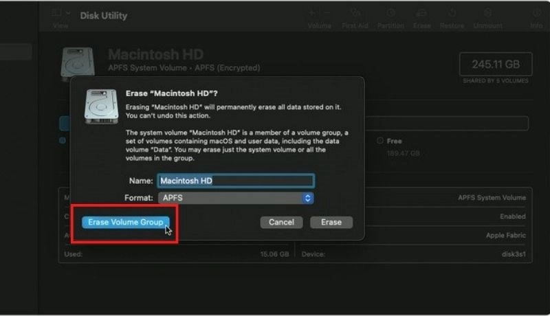 Bước 9: Click vào Erase Volume Group (xóa nhóm phân vùng).