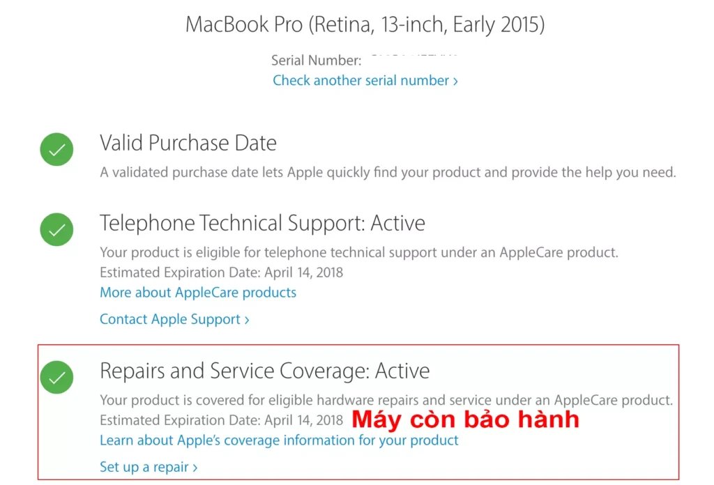 Nếu thông tin hiển thị Expired là MacBook đã hết hạn bảo hành. (hình 4)
