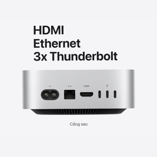 Vẫn là thiết kế quen thuộc Mac mini M4 (2024) sở hữu vẻ ngoài tối giản nhưng không kém phần sang trọng. Trọng lượng chưa đến 0.7kg giúp bạn dễ dàng bố trí máy ở bất kỳ không gian nào. Điểm cộng lớn là máy được trang bị đầy đủ các cổng kết nối hiện đại: Thunderbolt 4 (cho tốc độ truyền dữ liệu cực nhanh), USB-C, HDMI, cổng mạng Ethernet tốc độ cao (lên đến 10Gbps) và cả jack cắm tai nghe 3.5mm. Khả năng kết nối không dây cũng rất ấn tượng với Wi-Fi 6E và Bluetooth 5.3 đảm bảo kết nối internet và các thiết bị ngoại vi luôn ổn định.