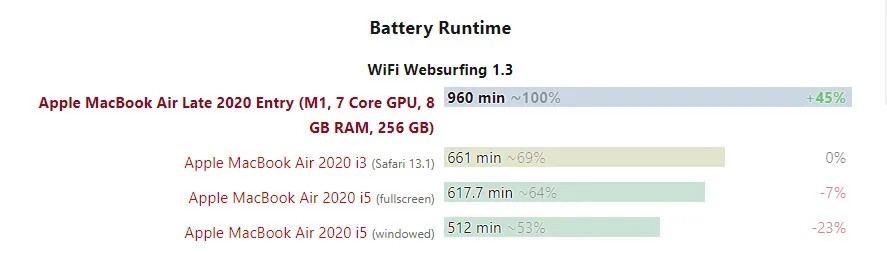 Thời gian sử dụng pin của hai model MacBook Air M1 và MacBook Air 2020 có sự chênh lệch khá nhiều