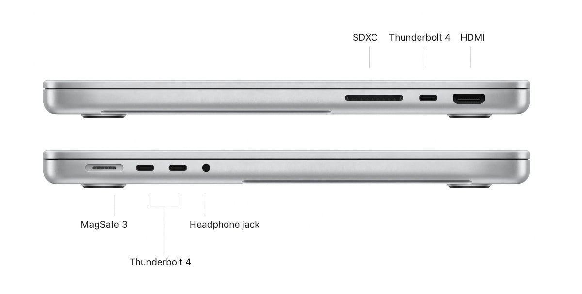 Cả hai model máy đều được trang bị 3 cổng Thunderbolt 4, một khe cắm thẻ dạng SDXC và cổng HDMI.