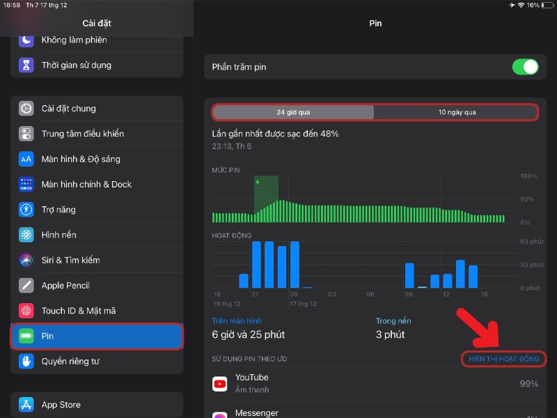 Chọn mục Pin để kiểm tra pin theo dõi trong 24 giờ qua hoặc 10 ngày qua tùy theo mong muốn của bạn